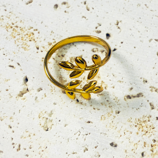 خاتم قابل للتعديل بتصميم أوراق الزيتون البسيط - مطلي بالذهب عيار 18 قيراطًا من الفولاذ المقاوم للصدأ 316L