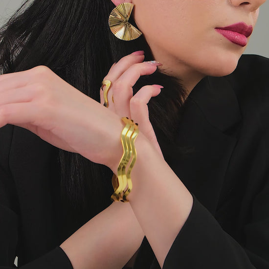 - Includes fan-shaped earrings, two abstract rings, a wavy pendant necklace, and a statement bangle